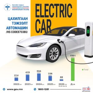 Сүүлийн жилүүдэд цахилгаан тэжээлт автомашины импорт тогтвортой өсөлттэй байсан ч 2025 оноос эхлэн буурч, 2026 оны эхний улиралд 88 ширхэг, 1.6 сая ам.долларын цахилгаан автомашин импортлогджээ.